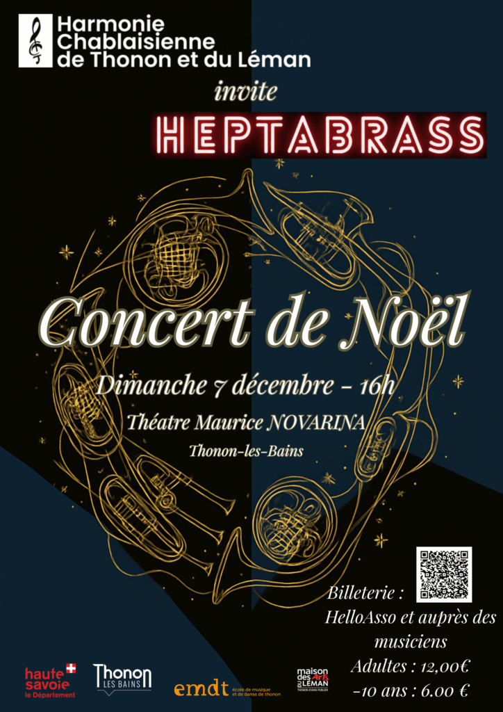 Un Noël éclatant sous le signe des cuivres ! En première partie, l’Harmonie Chablaisienne interprète le majestueux Praise Jerusalem! d’Alfred Reed et la vibrante Suite from Mass de Leonard Bernstein. La seconde partie mettra en lumière la force collective de l’ensemble de cuivres issu de la masterclass, avant de laisser place à l’énergie et au raffinement de l’ensemble Heptabrass pour clôturer la soirée en apothéose.